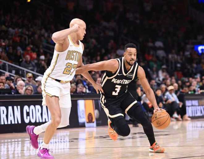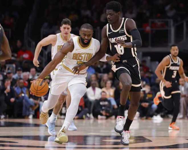 凱爾特人上一次客場119-114險勝熱火,老鷹過去兩場連續客場輸給湖人與開拓者遭遇2連敗。本場老鷹缺少丹尼爾斯、裡薩謝與波爾津吉斯,凱爾特人缺少普裡查德、塔圖姆與米諾特。首節開局凱爾特人7-2領先,佈朗持續得分率隊擴大14-6領先優勢,老鷹連追5分。佈朗繼續火力全開率隊拉開優勢,佈朗打滿首節13中6狂轟18+2+2,首節比賽結束凱爾特人30-23領先老鷹。首節凱爾特人23中11,其中三分9中3,老鷹僅23中8,其中三分7中2,傑倫3中0僅得到1分與麥科勒姆5中1得到4分。