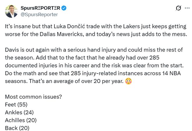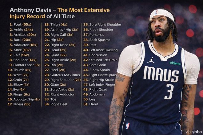 Garza表示:“戴維斯再度因左手嚴重傷勢缺陣……他職業生涯中被記錄在案的傷病已經超過285次,這筆交易的風險從一開始就顯而易見。簡單算筆賬就知道,14個NBA賽季裡出現285次傷病相關情況,平均每年超過20次。他最常見的傷病部位有哪些?腳部55次,腳踝24次,跟腱20次,背部20次。”