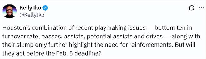 乍一看,考慮到當前的形勢,火箭隊在交易截止日前保持謹慎態度是可以理解的。但如果球隊持續表現不佳,在積分榜上的排名繼續下滑,那麼管理層很可能會做出調整。