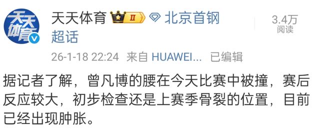 和寧波富邦的比賽,曾凡博和傑曼都出現瞭傷病情況,其中曾凡博的情況有些嚴重,他是腰部被撞瞭一下,賽後出現瞭腫脹的情況,檢查是上賽季出現骨裂的地方。北京首鋼稍後會安排曾凡博進行更詳細的檢查,但估計會休息一段時間。