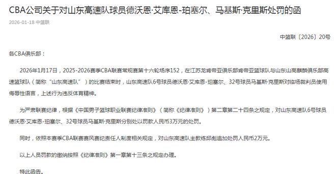 2026年1月17日,2025-2026賽季CBA聯賽常規賽第十六輪場序152,在江蘇龍肯帝亞俱樂部肯帝亞籃球隊與山東山高麒麟俱樂部高速籃球隊(簡稱“山東高速隊”)的比賽結束時,山東高速隊6號球員德沃恩·艾庫恩-珀塞爾、32號球員馬基斯·克裡斯對臨場裁判員使用侮辱性語言,上述行為違反體育精神。