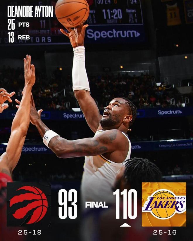 25分是艾頓加盟湖人以來的單場第二高分(此前拿過29分),他也成為瞭湖人隊史第一個單場以100%命中率拿下25分10籃板0失誤的球員。