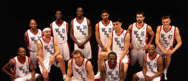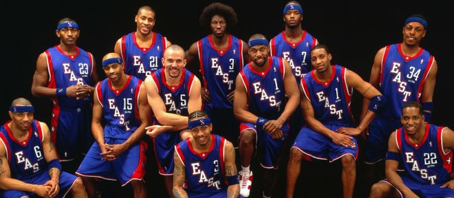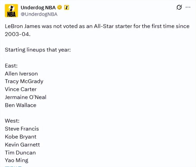 詹姆斯的新秀賽季效力於克利夫蘭騎士隊,彼時的東部全明星首發陣容由艾弗森、麥迪、卡特、本-華萊士與傑梅因-奧尼爾構成。西部全明星首發陣容為弗朗西斯、科比、加內特、蒂鄧肯以及姚明,這份名單堪稱星光熠熠。