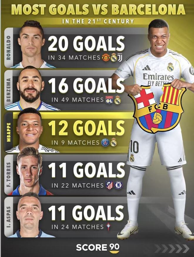 这份“21世纪对巴萨进球榜”最直观的画面,就是皇马的人长期站在前排:C罗34场20球,场均0.59;本泽马49场16球,场均0.33;姆巴佩9场12球,场均1.33。榜单里也有托雷斯22场11球(0.50)、阿斯帕斯24场11球(0.46)这样的名字,但把榜单的主轴撑起来的,还是皇马这条线。