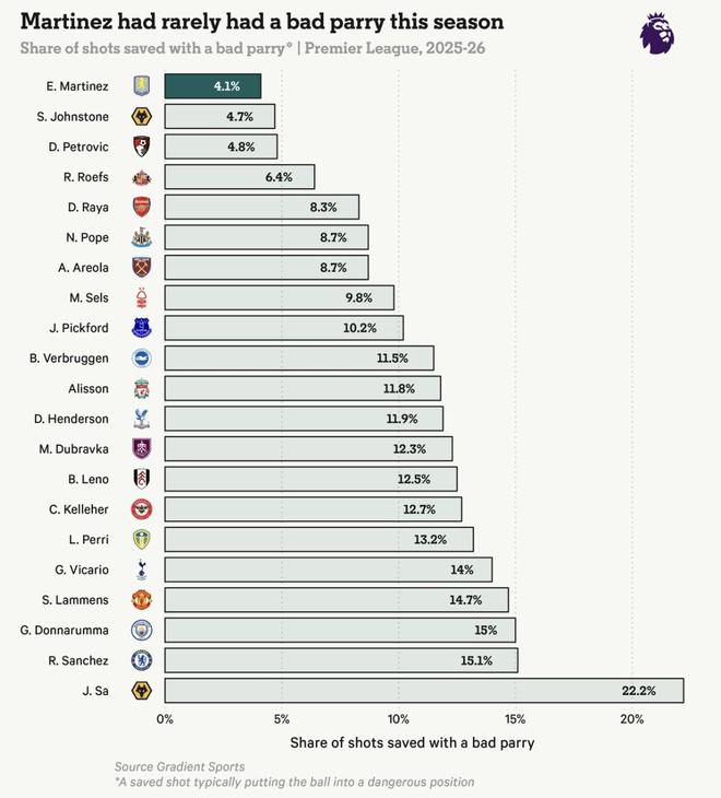 公平地說,這次失誤在整體射門撲救層面上仍屬個例。達米安-馬丁內斯在這一領域依然處於頂級水準。借助足球分析公司 Gradient Sports 的數據,可以評估本賽季英超出場時間超過900分鐘的門將中,“不理想撲救”所占的比例。