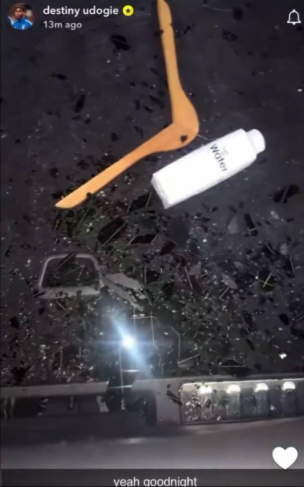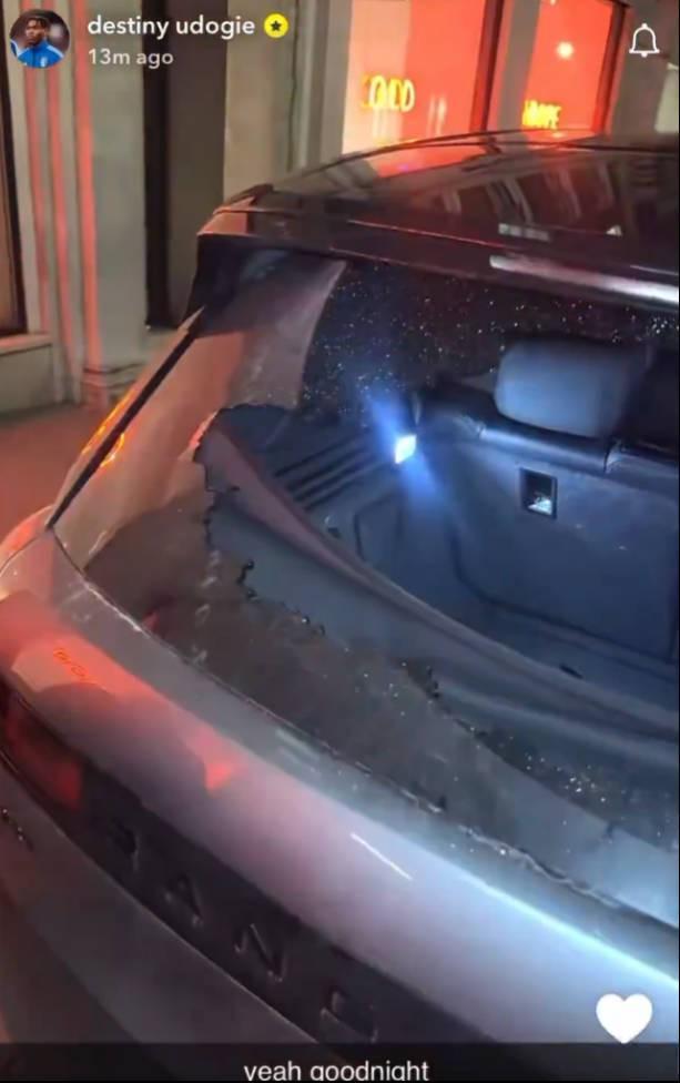烏多基曬出瞭自己的汽車的照片,可以看到,他的路虎攬勝後玻璃被砸碎,後備箱裡還散落著玻璃碎片,旁邊還有一個木制衣架和一個水箱,他配文:“太好瞭,晚安”。