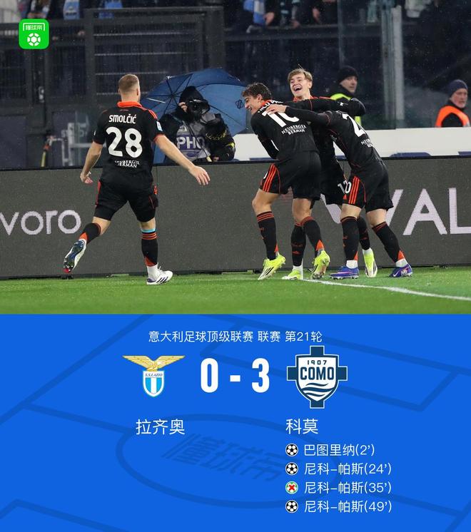 北京時間1月20日,意大利足球頂級聯賽第21輪,拉齊奧主場迎戰科莫。比賽開局階段,科莫球員阿萊士-巴列送出助攻,巴圖裡納破門得分,為球隊取得領先。隨後,卡克雷成功策動進攻,幫助尼科-帕斯再下一城。上半場臨近結束前,尼科-帕斯主罰點球未能命中,錯失擴大比分的機會。易邊再戰後,巴圖裡納完成助攻,尼科-帕斯接應破門,完成個人本場比賽第二次進球。最終全場比分定格在拉齊奧 0-3 科莫。